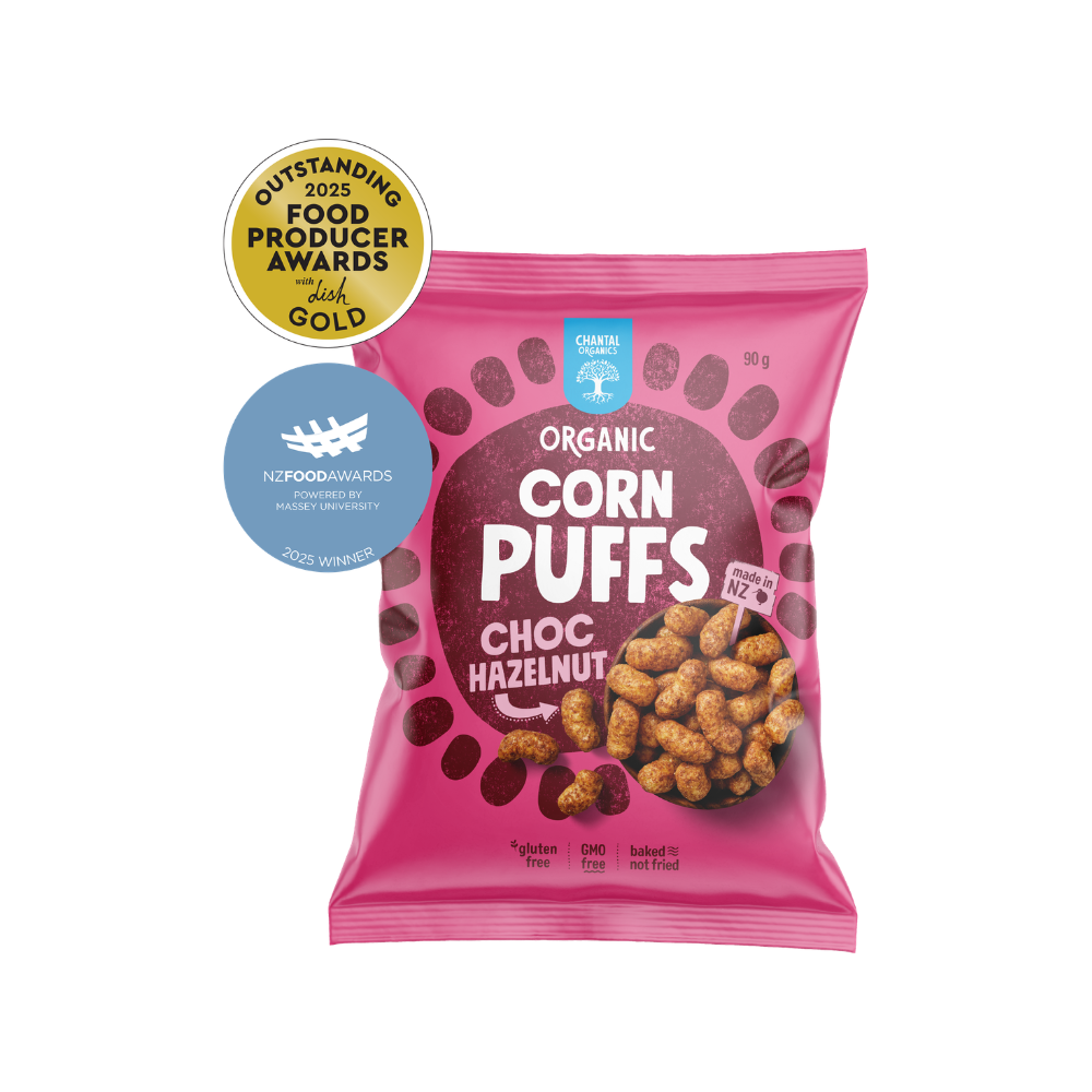 Chantal Organics Choc Hazelnut Corn Puffs are covered with our house-made organic hazelnut butter and rich and indulgent cocoa. This amazingly delicious puff is full of crunch, fun to munch, and tastes just like your favourite choc hazelnut spread.